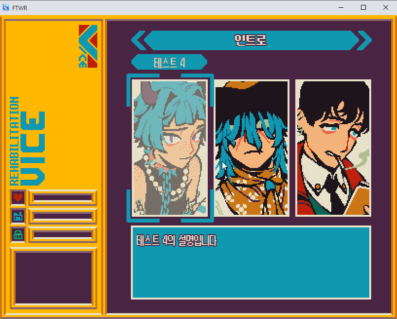 연료를 소모해서 3개의 갈림길 카드 중 하나로 이동하고, 카드에 해당하는 인카운터를 진행합니다. 현재 인카운터에는 선택지 고르기, 퍼즐, 난이도 체크(주사위 굴리기) 미니게임이 포함되어 있습니다. 스토리 진행을 위해 도전적인 미니게임은 뺐습니다만, 더 다양한 미니게임이 필요할지는 플레이 테스트를 거쳐서 확인해야 할 것 같습니다.