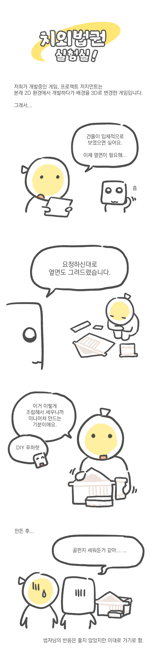 치외법권 실험실! #22026년 3월 15일안녕하세요!게임 개발중에 있었던 일을 만화로 그려보았습니다.즐감해주세요~!!2이전 포스트치외법권 실험실! #1다음 포스트가장 최근 포스트예요.댓글 0개첫 번째 댓글을 작성해 보세요!댓글 작성