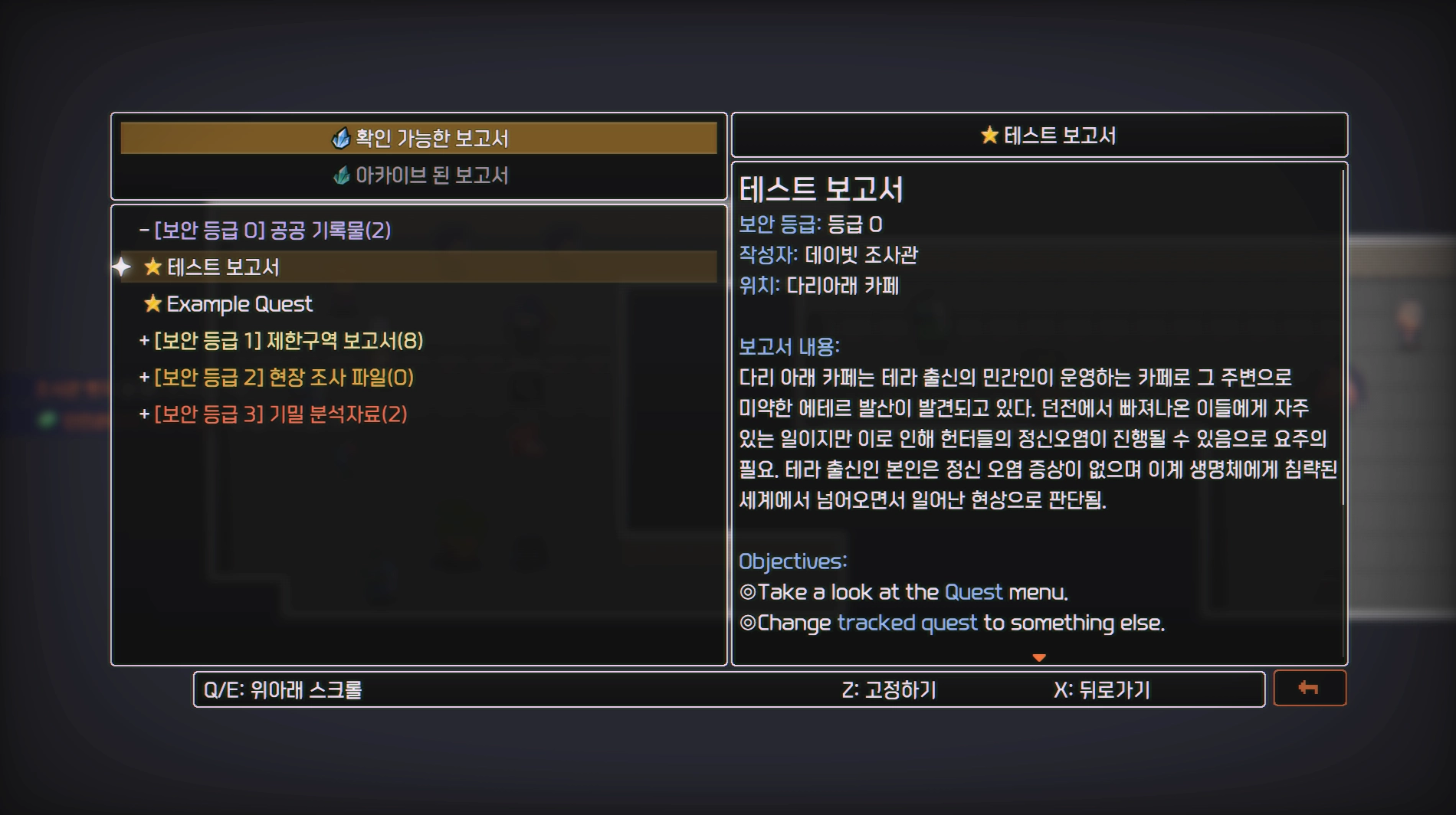 조사관 보고서: 퀘스트 시스템을 '조사관 보고서'라는 이름으로 다듬으며 내용을 채우고 있습니다. 글 쓰는 재미에 푹 빠져 보낸 한 주였네요.