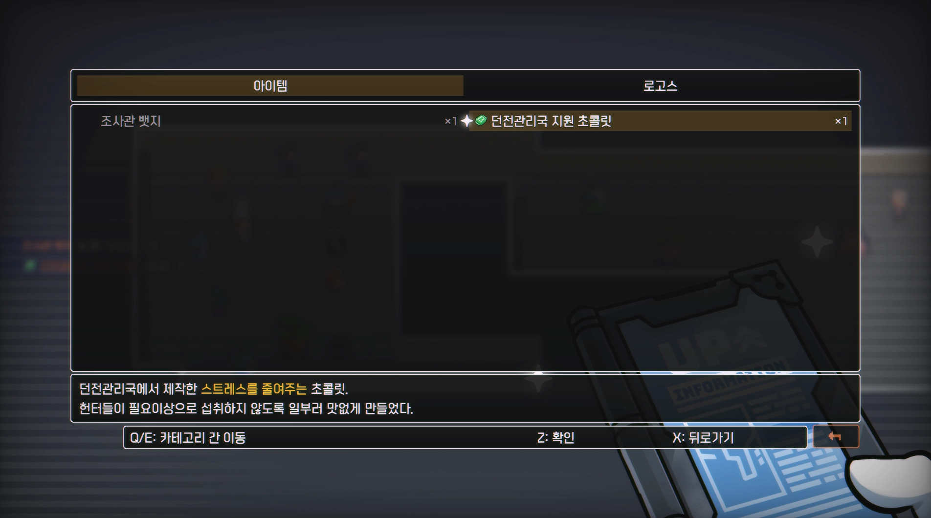 맛없는(?) 보급 물자: 기존의 밋밋한 'SP 포션'을 '관리국 지원 초콜릿'으로 바꿨습니다. "정말 필요할 때만 먹으라고 일부러 맛없게 만들었다"는 비하인드 설명을 넣으니 아이템 하나에도 생명력이 생기더라고요.