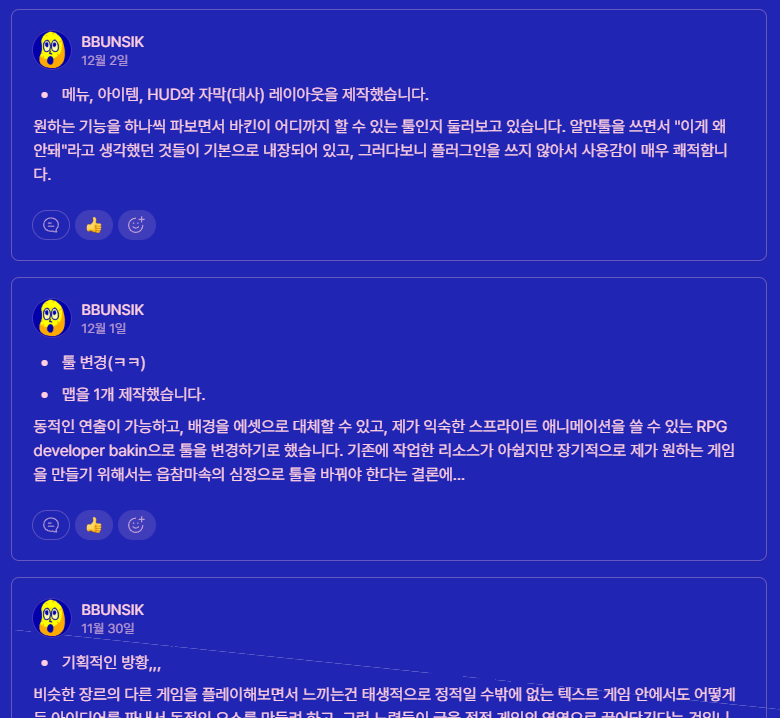 개인 홈페이지에 올리던 일간 작업일지의 캡처입니다. 이미지처럼 매일 어떤 작업을 했는지 요약해서 포스트합니다. 1월부터는 홈페이지의 업데이트를 중단하고 게임핑 등의 사이트에서 제공하는 유료 콘텐츠로 전환할 예정입니다.
