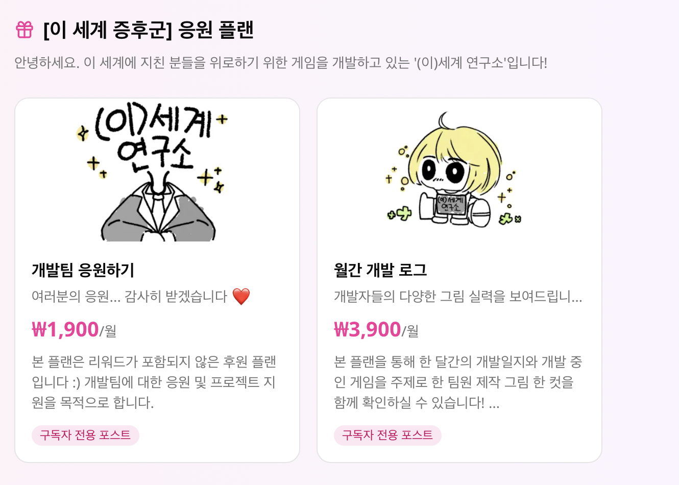 1티어 플랜에서는 매달 작성되는 개발 일지와 함께 팀원들이 돌아가며 직접 그린 그림 한 장을 제공해드립니다. 그림은 게임이나 팀에 대한 소소한 이야기들이 담긴 콘텐츠로 완성도 높은 일러스트라기보다는 여러분의 일상에 가볍게 웃을 수 있는 작은 재미 정도로 생각해주시면 좋을 것 같아요.